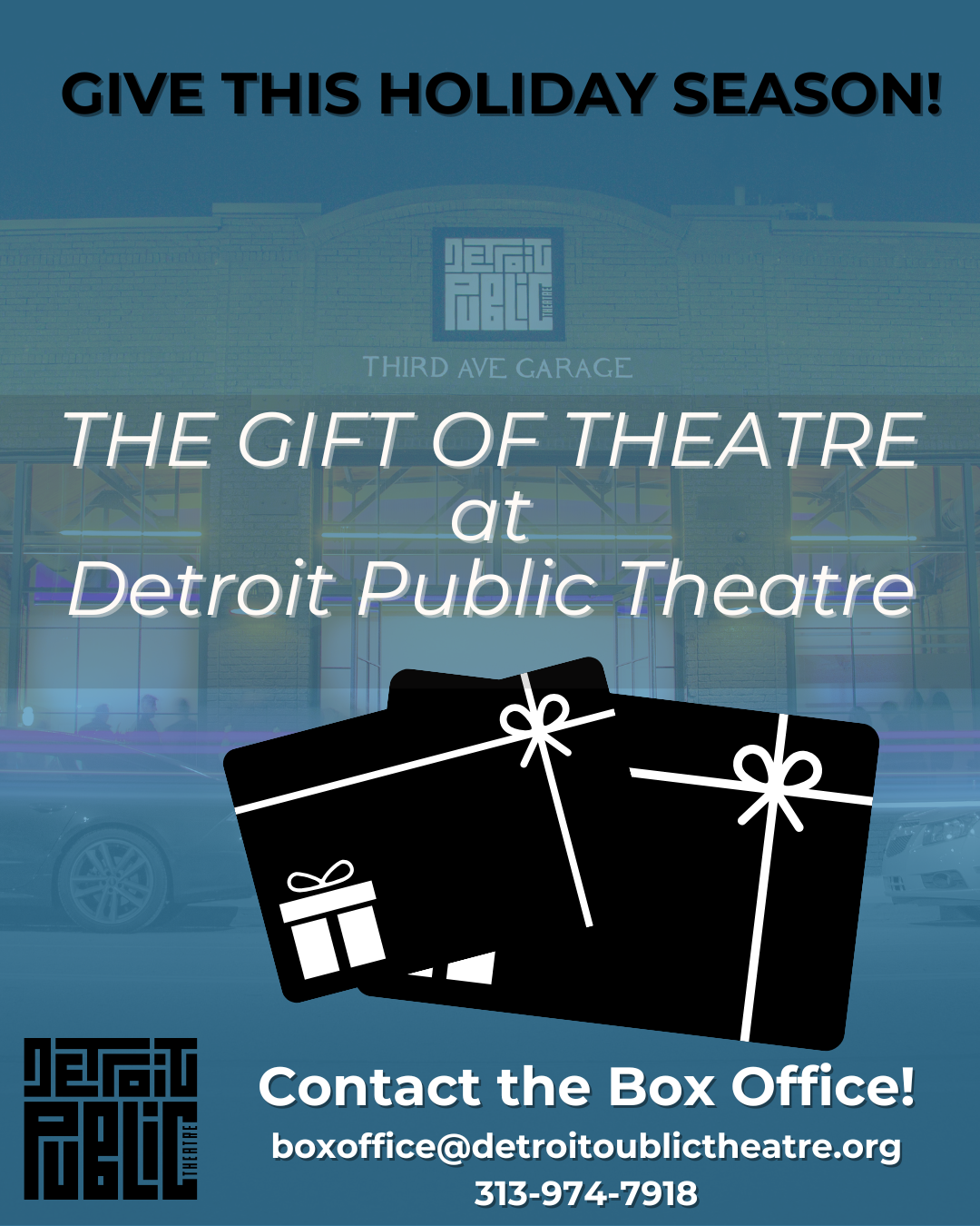 GIVE THE GIFT OF THEATRE! You can share your love of DPT with someone you care about by giving them a DPT gift certificate. Gift certificates are redeemable at the box office. There are multiple certificate options available. Please contact the DPT Box Office about the gift certificate that best suits your needs. Call or email them at 313-974-7918 or boxoffice@detroitpublictheatre.org. A team member will fulfill your order and arrange to send the physical or electronic gift certificate to the recipient of your choice.